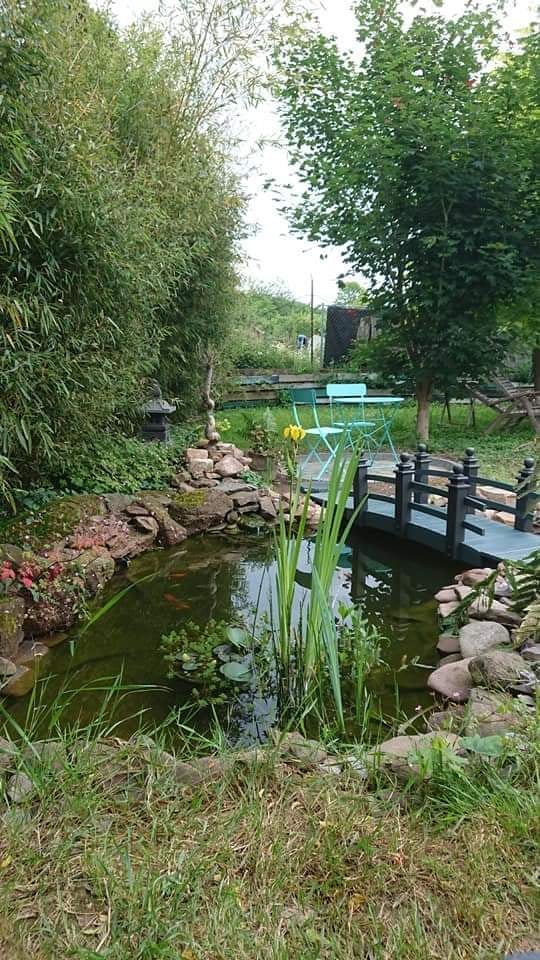 Exterieur: Terrasse pavée de 25m² avec salon de jardin, terrain privatif non clôturée avec un bassin à poissons.